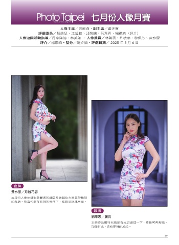 七月份人像月賽 人像主席/張淑貞·副主席/盧天寶 評選委員/蔡美足、江哲和、邱榮錦、葉青青、楊顯森(評介) 人像遊園活動指導/周李隆德、林美如 ·人像委員/林碧雲、許敏華、穆佩芬、黃水原 評介/楊顯森・監分/姚步慎·評選日期/ 2025 年 8 月 6 日 金牌 黃水原/月貌花容 本月份人像拍攝對參賽者的構圖及後製功力是非常難得 的考驗。恭喜作者在有限的條件下,能夠呈現此畫面。 銀牌 劉厚志/麗質 本張作品模特兒臉部有光斑處理一下,背景可再壓暗, 加強對比,會有更好的成績。 37