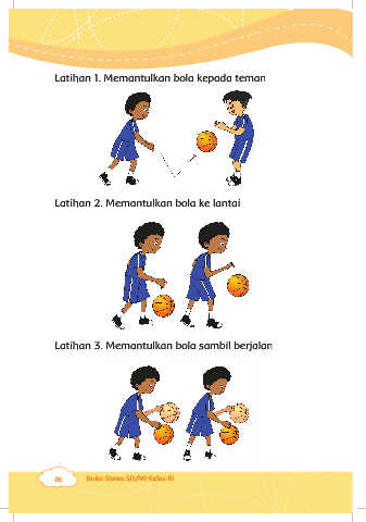 Latihan 1. Memantulkan bola kepada teman Latihan 2. Memantulkan bola ke lantai Latihan 3. Memantulkan bola sambil berjalan 78 Buku Siswa SD/MI Kelas III