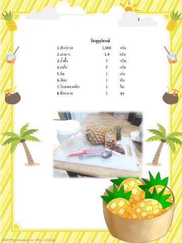 1 วัสดุอุปกรณ ์ 1.สับปะรด 1,000 กรัม 2.มะนาว 1.9 กรัม 3.น ้าผึ้ง 7 กรัม 4.เกลอ 7 กรัม ื ี 5.มด 1 เล่ม 6.เขียง 1 อัน 7.โหลพลาสติก 1 ใบ ุ 8.ช้อนตวง 1 ชด