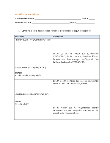 1.  Completa la tabla de análisis con funciones o descripciones según corresponda.