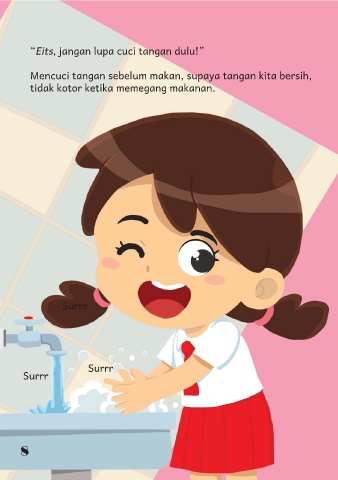 “Eits, jangan lupa cuci tangan dulu!” Mencuci tangan sebelum makan, supaya tangan kita bersih, tidak kotor ketika memegang makanan. Surrr Surrr Surrr 8