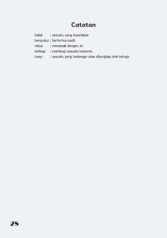 Catatan bekal : sesuatu yang disediakan bersyukur : berterima kasih rebus : memasak dengan air berbagi : membagi sesuatu bersama bunyi : sesuatu yang terdengar atau ditangkap oleh telinga 28