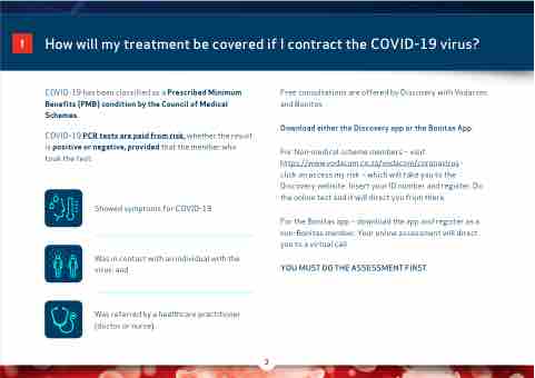 COVID-19 has been classi ed as a Prescribed Minimum Bene ts (PMB) condition by the Council of Medical Schemes.