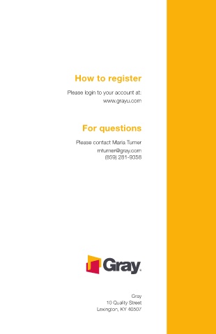 How to register Please login to your account at: www.grayu.com For questions Please contact Maria Turner mturner@gray.com (859) 281-9358 Gray 10 Quality Street Lexington, KY 40507