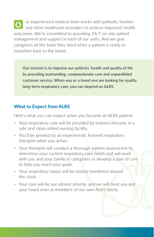 O ur experienced medical team works with patients families and other healthcare providers to achieve improved health health outcomes We’re committed to providing 24/7 on-site patient management and support in each of our units And we give caregivers all the the tools they need when a a a a a patient is ready to to transition back to the home What to Expect from ALRS Here’s what you you can expect when you you become an an ALRS patient: