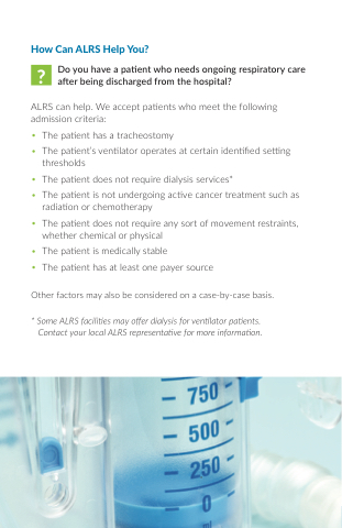 Some ALRS facilities may offer dialysis for ventilator patients Contact your local ALRS representative for for more information Do you have a a a a a a a a patient who needs ongoing respiratory care after being discharged from the hospital?