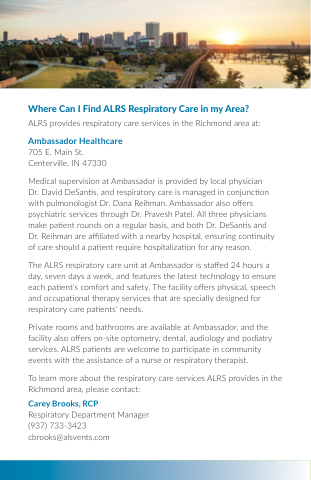 Medical supervision at Ambassador is is provided by local physician Dr David DeSantis and respiratory care tis is managed in conjunction with pulmonologist Dr Dana Reihman Ambassador also offers psychiatric services through Dr Pravesh Patel All three physicians make patient rounds on a a a a a a a a regular basis and and both Dr DeSantis and and Dr Reihman are affiliated with a a a a a a a nearby hospital ensuring continuity of care should a a a a a a a patient require hospitalization for any reason The ALRS respiratory care unit at at Ambassador is staffed 24 hours a a a a a a a day day seven days a a a a a a week and features the latest technology to ensure each patient’s comfort and safety The facility offers physical speech and occupational therapy services that are specially designed for respiratory care patients’ needs Private rooms rooms and and bathrooms are available at at at Ambassador and and the facility also offers on-site optometry dental audiology and podiatry services ALRS patients are welcome to participate in community events with the the assistance of a a a a a nurse or or respiratory therapist To learn more about the the respiratory care services ALRS provides in the the Richmond area please contact: