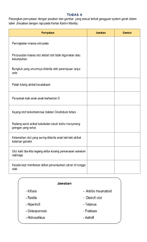 Pasangkan pernyataan dengan jawaban dan gambar yang sesuai terkait gangguan system gerak dalam