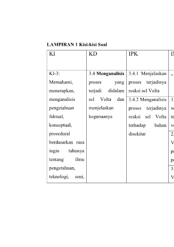 Menjelaskan - - terjadinya reaksi sel Volta 8 1. Disajikan gambar berupa rangkaian sel Volta serta 3.4.2 Menganalisis proses menganalisis mampu didik peserta wacana, terjadinya terjadinya sel Volta berdasarkan gambar rangkaian sel Volta sel volta tersebut. bahan 9 2. Disajikan suatu wacana tentang salah satu contoh sel Volta yaitu sel aki, peserta didik mampu menganalisi proses reaksi sel Volta yang