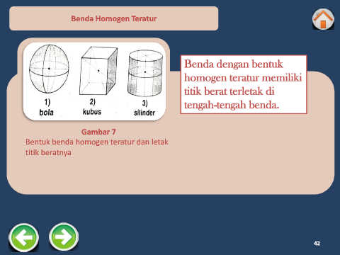 Benda Homogen Teratur Benda dengan bentuk homogen teratur memiliki titik berat terletak di tengah-tengah benda. Gambar 7 Bentuk benda homogen teratur dan letak titik beratnya 42