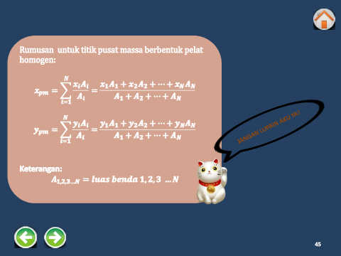 Rumusan untuk titik pusat massa berbentuk pelat homogen: + + ⋯ + = = + + ⋯ + < + + ⋯ + = = + + ⋯ + < Keterangan: , , … = , , … 45