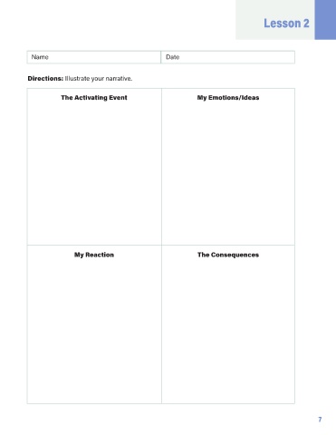 Lesson 2 Name Date Directions: Illustrate your narrative. The Activating Event My Emotions/Ideas My Reaction The Consequences 7 Book_for_Students_August_5.indd 7 12/1/21 3:53 PM