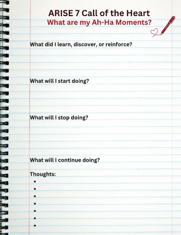 ARISE 7 Call of the Heart What are my Ah-Ha Moments? What did I learn, discover, or reinforce? What will I start doing? What will I stop doing? What will I continue doing? Thoughts: