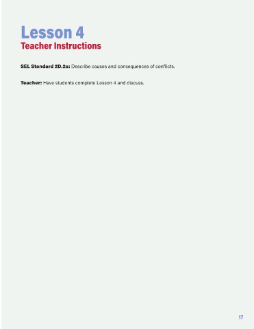 Lesson 4 Teacher Instructions SEL Standard 2D.2a: Describe causes and consequences of conflicts. Teacher: Have students complete Lesson 4 and discuss. 17 Book_for_Teachers_July_29.indd 17 12/1/21 3:00 PM