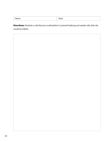 Name Date Directions: Illustrate a role that you could perform to prevent bullying and explain why that role would be helpful. 46 Book_for_Students_August_5.indd 46 12/1/21 3:54 PM