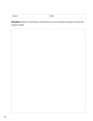 Name Date Directions: Illustrate a role that you could perform to prevent bullying and explain why that role would be helpful. 48 Book_for_Students_August_5.indd 48 12/1/21 3:54 PM