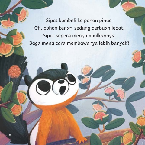 Sipet kembali ke pohon pinus. Oh, pohon kenari sedang berbuah lebat. Cara ini tidak bisa. Sipet segera mengumpulkannya. Bagaimana cara membawanya lebih banyak? 8 9