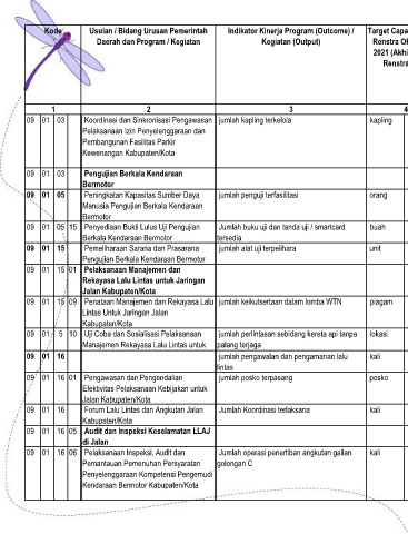 Indikator Kinerja Program (Outcome) / Kegiatan (Output) 3 jumlah kapling terkelola jumlah penguji terfasilitasi Jumlah buku uji dan tanda uji / smartcard tersedia jumlah alat uji terpelihara jumlah perlintasan sebidang kereta api tanpa palang terjaga jumlah pengawalan dan pengamanan lalu lintas jumlah posko terpasang Jumlah Koordinasi terlaksana Jumlah operasi penertiban angkutan galian golongan C