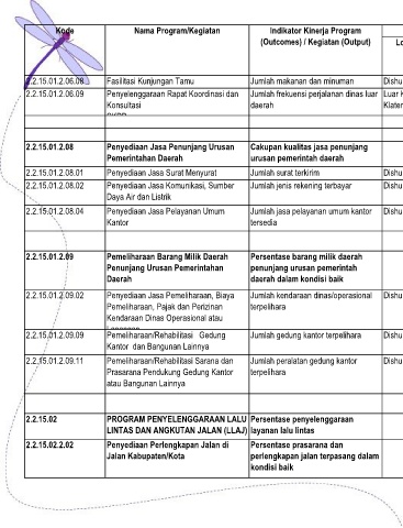 Nama Program/Kegiatan Fasilitasi Kunjungan Tamu Penyelenggaraan Rapat Koordinasi dan Konsultasi Penyediaan Jasa Penunjang Urusan Pemerintahan Daerah Penyediaan Jasa Surat Menyurat Penyediaan Jasa Komunikasi, Sumber Daya Air dan Listrik Penyediaan Jasa Pelayanan Umum Pemeliharaan Barang Milik Daerah Penunjang Urusan Pemerintahan Penyediaan Jasa Pemeliharaan, Biaya Pemeliharaan, Pajak dan Perizinan Kendaraan Dinas Operasional atau Lapangan Pemeliharaan/Rehabil