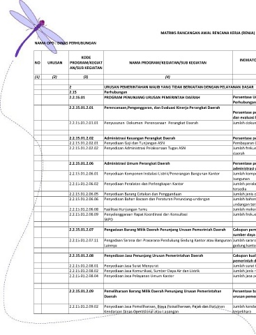 NAMA OPD : DINAS PERHUBUNGAN KODE PROGRAM/KEGIAT URUSAN NO AN/SUB KEGIATAN (3) (2) (1) 2 2.15 2.2.15.01 2.2.15.01.2.01 2.2.15.01.2.01.01 2.2.15.01.2.02 2.2.15.01.2.02.01 2.2.15.01.2.02.02 2.2.15.01.2.06 2.2.15.01.2.06.01 2.2.15.01.2.06.02 2.2.15.01.2.06.05 2.2.15.01.2.06.06 2.2.15.01.2.06.08 2.2.15.01.2.06.09 2.2.15.01.2.07 2.2.15.01.2.07.11 2.2.15.01.2.08 2.2.15.01.2.08.01 2.2.15.01.2.08.02 2.2.15.01.2.08.04 2.2.15.01.2.09 2.2.15.01.2