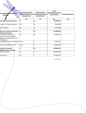 NAMA PROGRAM/KEGIATAN/SUB KEGIATAN (4) Persetujuan Hasil Analisis Dampak Lalu Lintas (Andalalin) untuk Jalan Koordinasi dan sinkronisasi penilaian hasil andalalin Pengawasan pelaksanaan rekomendasi andalalin Pelaksanaan Inspeksi, Audit dan Pemantauan Pemenuhan Persyaratan Penyelenggaraan Kompetensi Pengemudi Kendaraan Bermotor Penyediaan Angkutan Umum untuk Jasa Angkutan Orang dan/atau Barang Antar Kota dalam 1 (Satu) Daerah Kabupaten/Kota Penyediaan Angkutan U