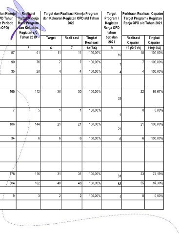 Target Program / Kegiatan Renja OPD tahun berjalan Tingkat 2021 Realisasi 9 8=(7/6) 100,00% 10 100,00% 7 100,00% 4 100,00% 33 100,00% 1 100,00% 21 100,00% 6 100,00% 31 100,00% 63 100,00% 1
