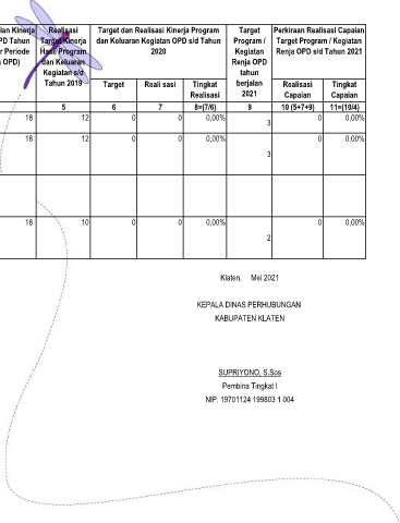 Target Program / Kegiatan Renja OPD tahun berjalan Tingkat 2021 Realisasi 9 8=(7/6) 0,00% 3 0,00% 3 0,00% 2 Klaten, Mei 2021 KEPALA DINAS PERHUBUNGAN KABUPATEN KLATEN SUPRIYONO, S.Sos Pembina Tingkat I NIP. 19701124 199803 1 004