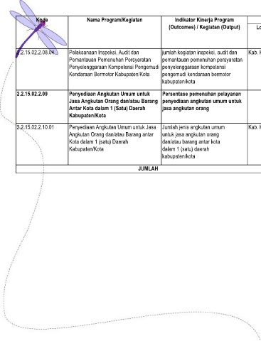 Nama Program/Kegiatan Pelaksanaan Inspeksi, Audit dan Pemantauan Pemenuhan Persyaratan Penyelenggaraan Kompetensi Pengemudi Kendaraan Bermotor Kabupaten/Kota Penyediaan Angkutan Umum untuk Jasa Angkutan Orang dan/atau Barang Antar Kota dalam 1 (Satu) Daerah Kabupaten/Kota Penyediaan Angkutan Umum untuk Jasa Angkutan Orang dan/atau Barang antar Kota dalam 1 (satu) Daerah Kabupaten/Kota JUMLAH