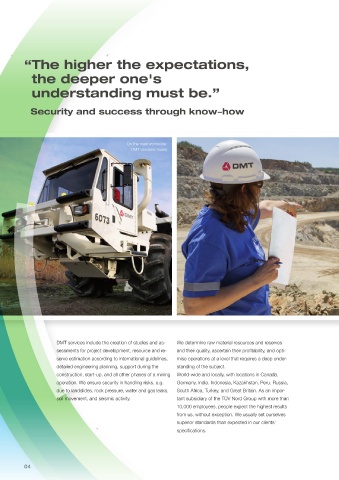 DMT services include the creation of studies and as- We determine raw material resources and reserves The first-class training and education of our employ- We also adhere to local and international techni-