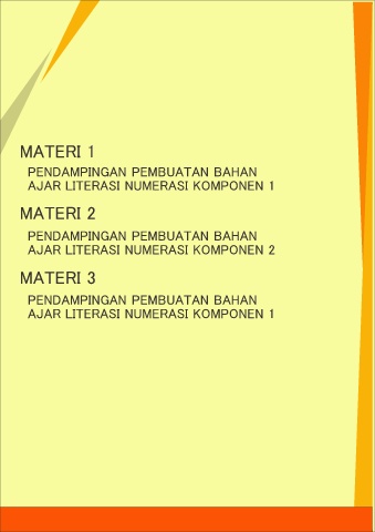 MATERI 1 PENDAMPINGAN PEMBUATAN BAHAN AJAR LITERASI NUMERASI KOMPONEN 1 MATERI 2 PENDAMPINGAN PEMBUATAN BAHAN AJAR LITERASI NUMERASI KOMPONEN 2 MATERI 3 PENDAMPINGAN PEMBUATAN BAHAN AJAR LITERASI NUMERASI KOMPONEN 1