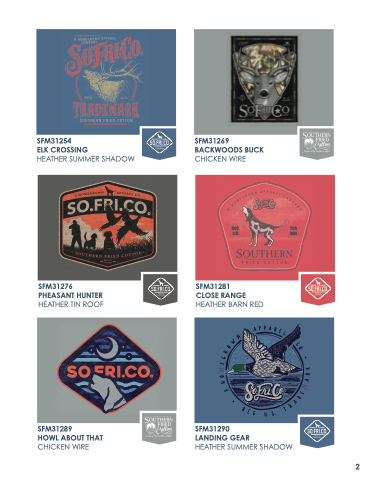 SFM31254 ELK CROSSING HEATHER SUMMER SHADOW SFM31269 BACKWOODS BUCK CHICKEN WIRE SFM31276 PHEASANT HUNTER HEATHER TIN ROOF SFM31281 CLOSE RANGE HEATHER BARN RED SFM31289 HOWL ABOUT THAT CHICKEN WIRE SFM31290 LANDING GEAR HEATHER SUMMER SHADOW 2