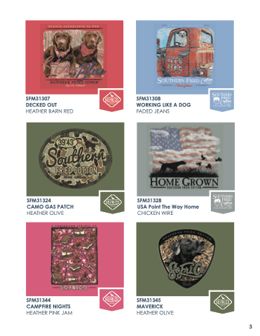 SFM31307 DECKED OUT HEATHER BARN RED SFM31308 WORKING LIKE A DOG FADED JEANS SFM31324 CAMO GAS PATCH HEATHER OLIVE SFM31328 USA Point The Way Home CHICKEN WIRE SFM31344 CAMPFIRE NIGHTS HEATHER PINK JAM SFM31345 MAVERICK HEATHER OLIVE 3