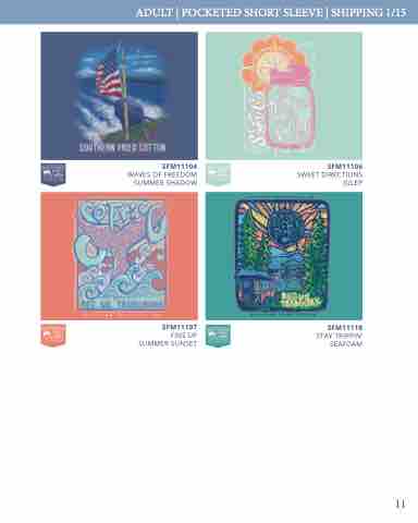 ADULT | POCKETED SHORT SLEEVE | SHIPPING 1/15 SFM11104 WAVES OF FREEDOM SUMMER SHADOW SFM11106 SWEET DIRECTIONS JULEP SFM11107 FINS UP SUMMER SUNSET SFM11118 STAY TRIPPIN’ SEAFOAM 11