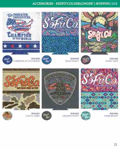 ACCESSORIES - KEEPITCOLDERLONGERTM | SHIPPING 1/15 SFA1058 CHAMPION OF THE WORLD SFA1059 BLUE PAISLEY SFA1060 SUNNY DAZE SFA1061 SoFriCo CAMO SFA1062 GADSDEN PATCH SFA1063 SHINE BRIGHT 25