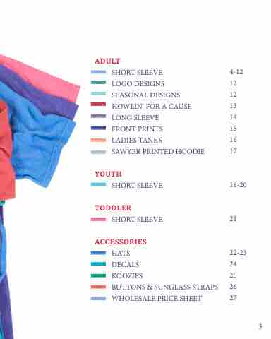 SHORT SLEEVE 4-12 LOGO DESIGNS 12 SEASONAL DESIGNS 12 HOWLIN’ FOR A CAUSE 13 LONG SLEEVE 14 FRONT PRINTS 15 LADIES TANKS 16 SAWYER PRINTED HOODIE 17