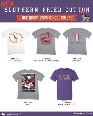 SFM10542 FIRST AND TEN SFM10825 SFM11229 SOUTHERN FRIED SATURDAYS BEAT’EM ALL SFM11237 QB1 SFM11230 HOME GROWN TEAM *48 PIECE MINIMUM SHIPPING DATE 7/1 13 *NEW