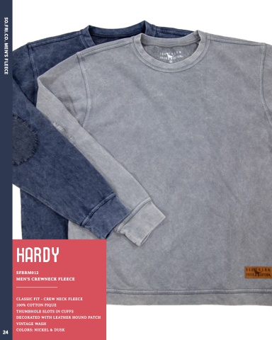 24 SFBRM012 MEN'S CREWNECK FLEECE CLASSIC FIT - CREW NECK FLEECE 100% COTTON PIQUE THUMBHOLE SLOTS IN CUFFS DECORATED WITH LEATHER HOUND PATCH VINTAGE WASH COLORS: NICKEL & DUSK SO.FRI.CO. MEN’S FLEECE