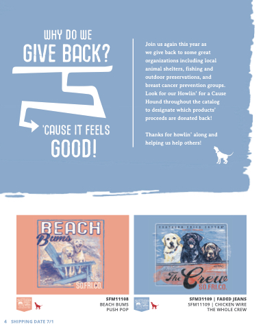 we give back to some great organizations including local animal shelters, fishing and outdoor preservations, and breast cancer prevention groups. Look for our Howlin’ for a Cause Hound throughout the catalog