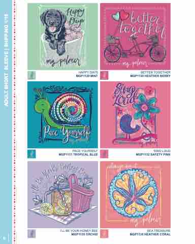 6 HAPPY DAYS MGP1129 MINT BETTER TOGETHER MGP1130 HEATHER BERRY PACE YOURSELF MGP1131 TROPICAL BLUE SING LOUD MGP1132 SAFETY PINK I’LL BE YOUR HONEY BEE SEA TREASURE MGP1135 ORCHID MGP1136 HEATHER CORAL ADULT SHORT SLEEVE | SHIPPING 1/15