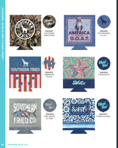 18 SFA1067 SOUTHERN TRADITIONS SFA1075 THE ORIGINAL G G O O A T SFA1073 AMERICAN PATCH SFA1076 STARSTRUCK SHIPPING DATE 1/15 SFA1074 RED WHITE & TUNA SFA1077 OCEAN FLORAL ACCESSORIES - SO SO FRI CO CO KEEP IT COLDER LONGER TM