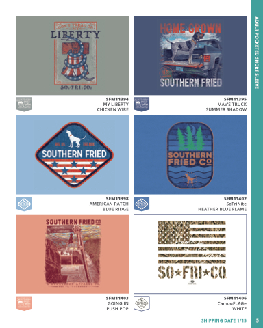 ADULT POCKETED SHORT SLEEVE SHIPPING DATE 1/15 5 5 SFM11403 GOING IN IN PUSH POP SFM11406 CamouFLAGe WHITE SFM11394 MY LIBERTY CHICKEN WIRE SFM11395 MAV’S TRUCK SUMMER SHADOW SFM11398 AMERICAN PATCH BLUE RIDGE SFM11402 SoFriNite HEATHER BLUE FLAME