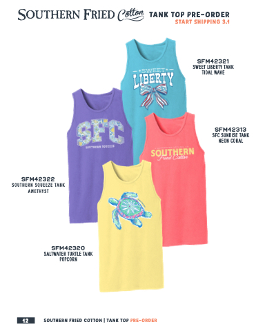 TANK TOP PRE-ORDER start SHIPPING 3.1 SFM42321 SWEET LIBERTY TANK TIDAL WAVE SFM42313 SFC SUNRISE TANK NEON CORAL SFM42322 SOUTHERN SQUEEZE TANK AMETHYST SFM42320 SALTWATER TURTLE TANK POPCORN 12 SOUTHERN FRIED COTTON | TANK TOP PRE-ORDER