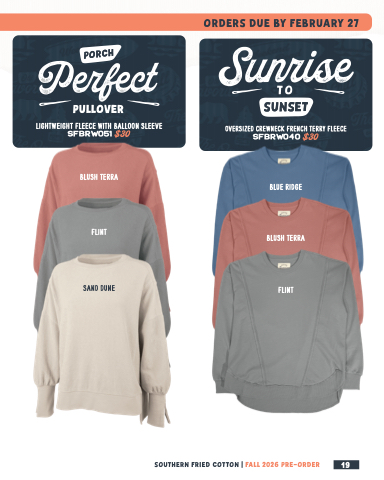 ORDERS DUE BY FEBRUARY 27 PULLOVER Lightweight fleece with balloon sleeve SFBRW051 $30 Oversized crewneck french terry fleece SFBRW040 $30 BLUSH TERRA BLUE RIDGE FLINT BLUSH TERRA SAND DUNE FLINT SOUTHERN FRIED COTTON | FALL 2026 PRE-ORDER 19