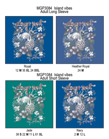 Royal 12 M 35 XL 24 XXL Heather Royal 24 M MGP3084 Island vibes Adult Long Sleeve MGP1084 Island vibes Adult Short Sleeve Jade 38 S 22 M 11 L 61 XL Navy 2 M 12 L