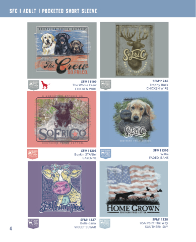 SFC i ADULT i POCKETED SHORT SLEEVE 4 SFM11327 Belle-dana VIOLET SUGAR SFM11328 USA Point The Way SOUTHERN SKY SFM11109 The Whole Crew CHICKEN WIRE SFM11246 Trophy Buck CHICKEN WIRE SFM11303 Boykin STANiel CAYENNE SFM11305 Willie FADED JEANS