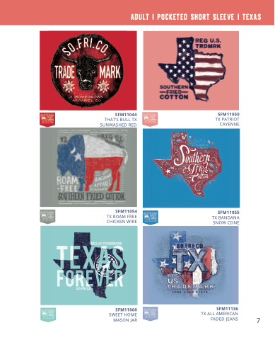 SFM11044 THAT’S BULL TX SUNWASHED RED SFM11050 TX PATRIOT CAYENNE SFM11055 TX BANDANA SNOW CONE SFM11054 TX ROAM FREE CHICKEN WIRE SFM11060 SWEET HOME MASON JAR SFM11136 TX ALL AMERICAN FADED JEANS 7 ADULT i POCKETED SHORT SLEEVE i TEXAS
