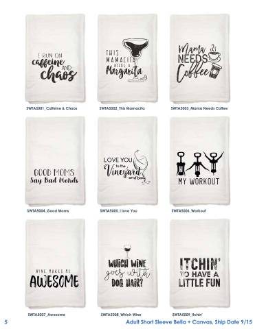 SWTA5001_Caffeine & Chaos SWTA5002_This Mamacita SWTA5003_Mama Needs Coffee SWTA5004_Good Moms SWTA5005_I love You SWTA5006_Workout SWTA5009_Itchin' 5 Adult Short Sleeve Bella + Canvas, Ship Date 9/15 SWTA5007_Awesome SWTA5008_Which Wine