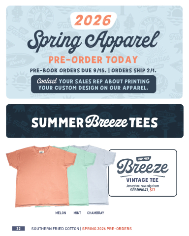 SUMMER TEES Breeze VINTAGE TEE Jersey tee, raw edge hem SFBRW047, $17 MINT MELON CHAMBRAY 22 SOUTHERN FRIED COTTON | SPRING 2026 PRE-ORDERS