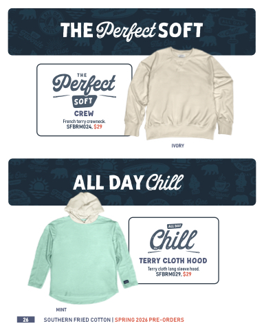 Perfect CREW French terry crewneck. SFBRM024, $29 IVORY TERRY CLOTH HOOD Terry cloth long sleeve hood. SFBRM029, $29 26 MINT SOUTHERN FRIED COTTON | SPRING 2026 PRE-ORDERS