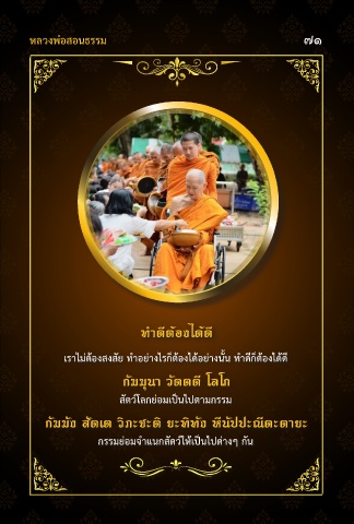 หลวงพ่อสอนธรรม 71 ท�ำดีต้องได้ดี เราไม่ต้องสงสัย ท�าอย่างไรก็ต้องได้อย่างนั้น ท�าดีก็ต้องได้ดี กัมมุนำ วัตตตี โลโก สัตว์โลกย่อมเป็นไปตามกรรม กัมมัง สัตเต วิภะชะติ ยะทิทัง หีนัปปะณีตะตำยะ กรรมย่อมจ�าแนกสัตว์ให้เป็นไปต่างๆ กัน